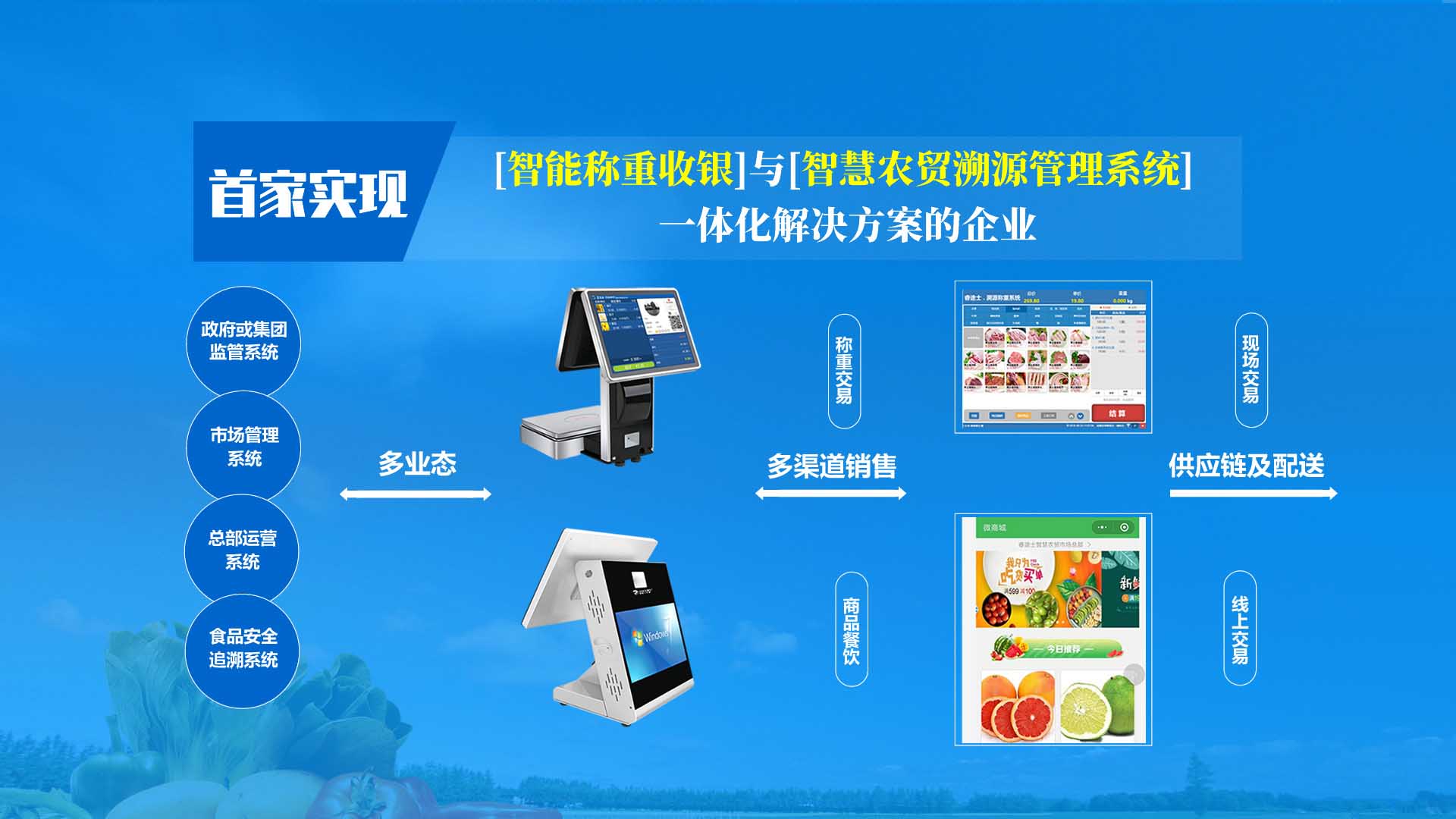 創(chuàng)新實(shí)現(xiàn)了【智慧農(nóng)貿(mào)溯源管理系統(tǒng)】與【智能稱重收銀】一體化解決方案,集市場(chǎng)管理、運(yùn)營(yíng)管理、溯源追溯、智能收銀大數(shù)據(jù)運(yùn)用于一體,硬件、軟件與管理系統(tǒng)完美結(jié)合。適用于農(nóng)批、農(nóng)貿(mào)市場(chǎng)蔬菜、生鮮、水果、水產(chǎn)、肉類、熟食等稱重和非稱重銷售;由于采用一體化設(shè)計(jì),解決了傳統(tǒng)農(nóng)貿(mào)市場(chǎng)無(wú)法實(shí)現(xiàn)的信息化、智能化、可追溯的管理問(wèn)題;使稱重、收銀、追溯、管理、更透明、公正、安全,讓顧客無(wú)后顧之憂,給管理工作帶來(lái)極大的便捷與高效,對(duì)國(guó)內(nèi)農(nóng)產(chǎn)品行業(yè)的發(fā)展、農(nóng)產(chǎn)品流通管理起到了典范作用。